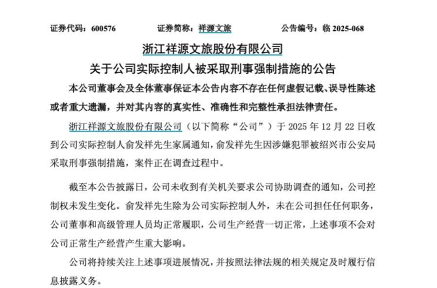 这场阛阓风暴的径直导火索,源于前一日晚间三家上市公司同步发布的一则重磅公告。12月22日晚间,祥源文旅、交建股份接踵发布公告,证据了一个重要信息:公司本色规章东说念主、祥源控股集团有限累赘公司董事长俞开头,因涉嫌造孽被绍兴市公安局接受刑事强制步履,案件正在拜谒历程中。港股上市的海昌海洋公园也公告称,公司董事会主席、执行董事兼行政总裁俞开头因涉嫌造孽被接受强制步履。