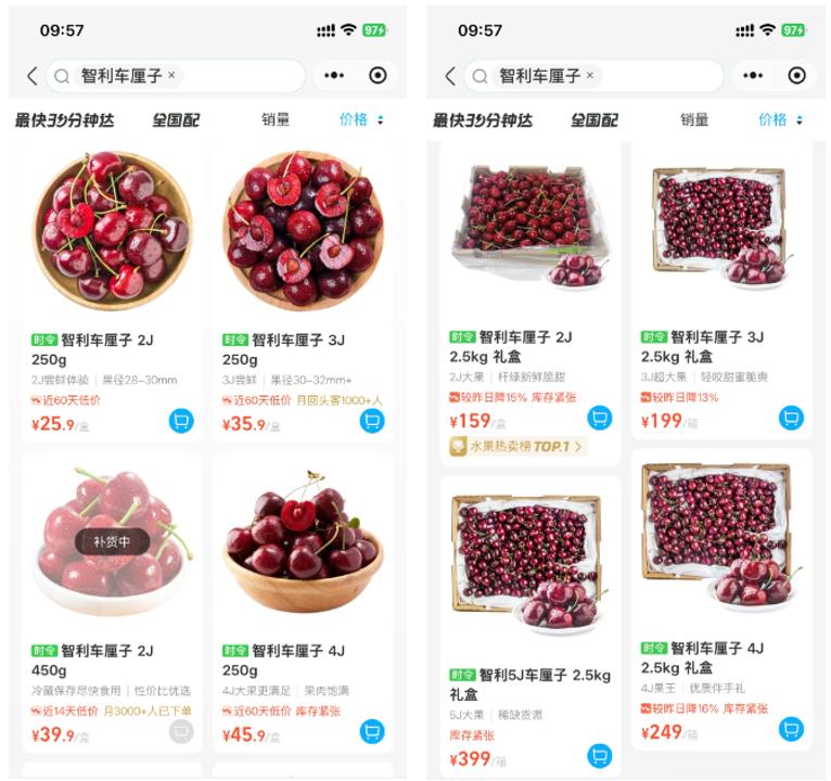 盒马APP暴露,2J、3J、4J、5J2.5KG礼盒的智利车厘子,售价辞别为159元、199元、249元和399元,均为近30天的最廉价。