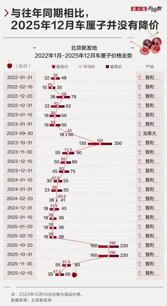 因为物流资本的变化,车厘子的批发价钱果然跌了许多,但若是把时辰线拉得更长一些,就会发现,其实当今的车厘子价钱也并莫得几许优惠,所谓“腰斩”,其实是跟10、11月的高价比出来的。